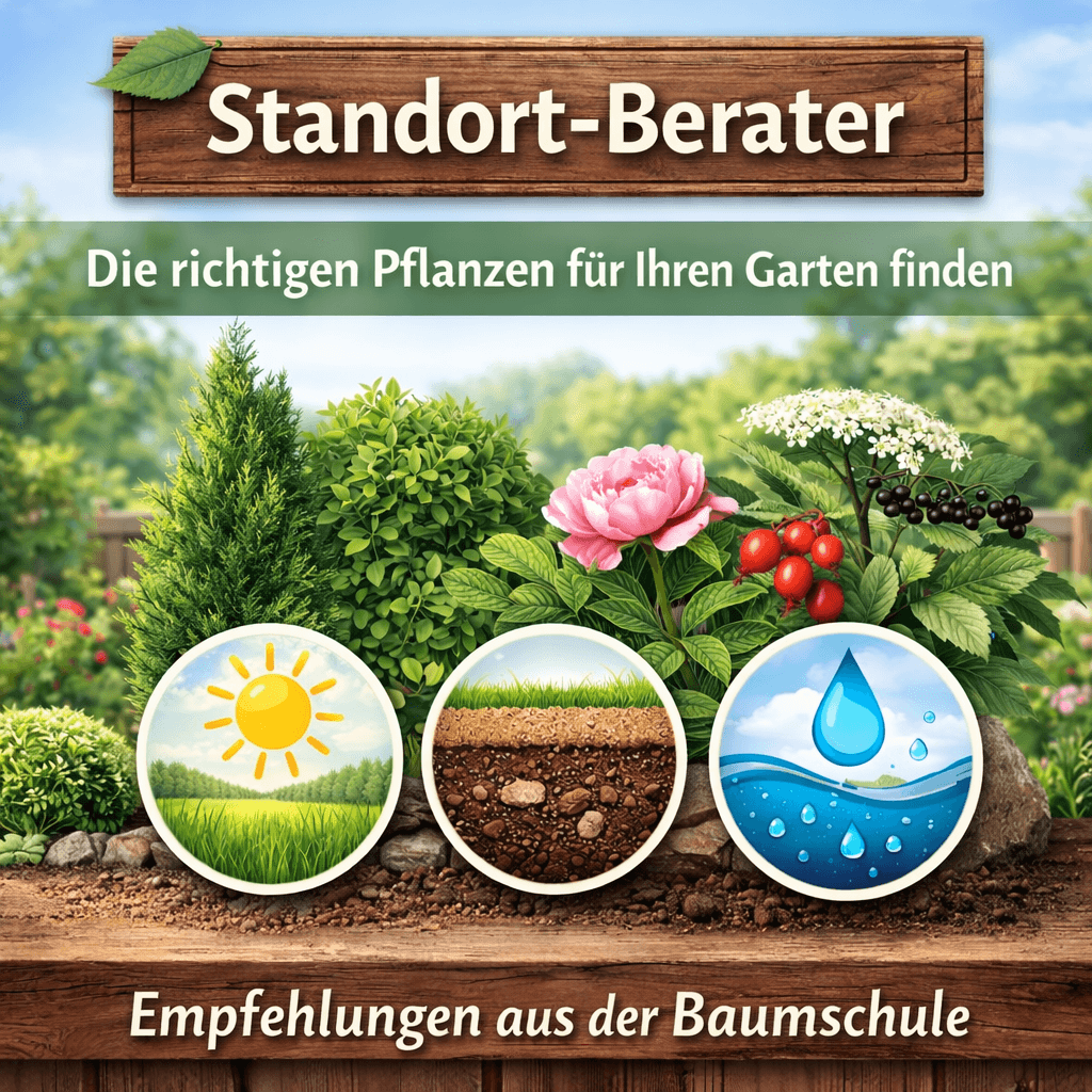 Mit unseremStandort-Beraterfinden Sie schnell heraus,welche Pflanzen zu Ihrem Garten passen. Wählen Sie Pflanzenart sowie Lichtverhältnisse, Boden und Feuchtigkeit – der Berater empfiehlt geeigneteLaubholz-, Nadelholz- und rosenartige Pflanzenaus der Baumschule.
